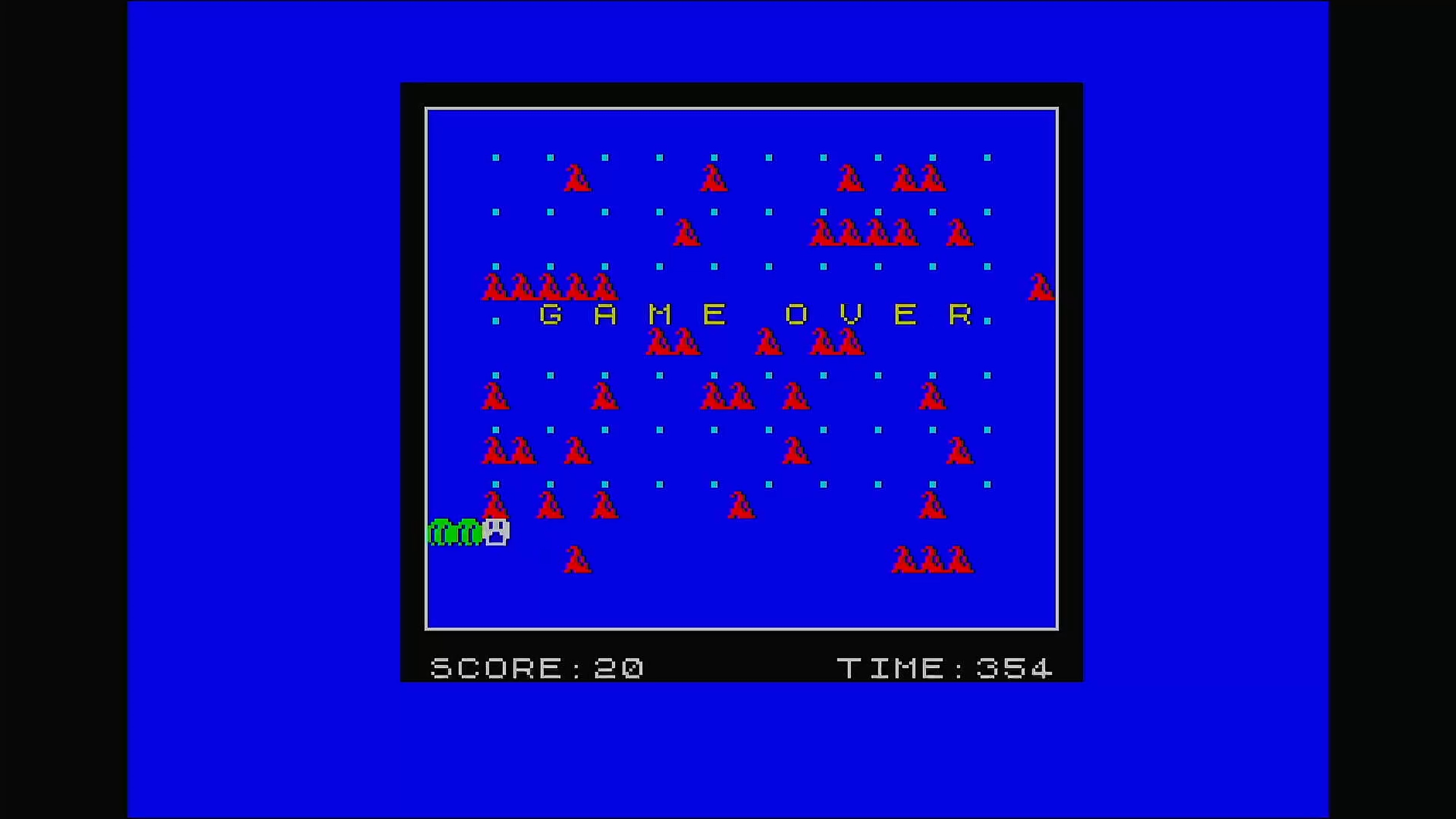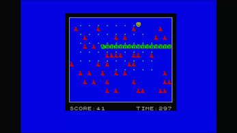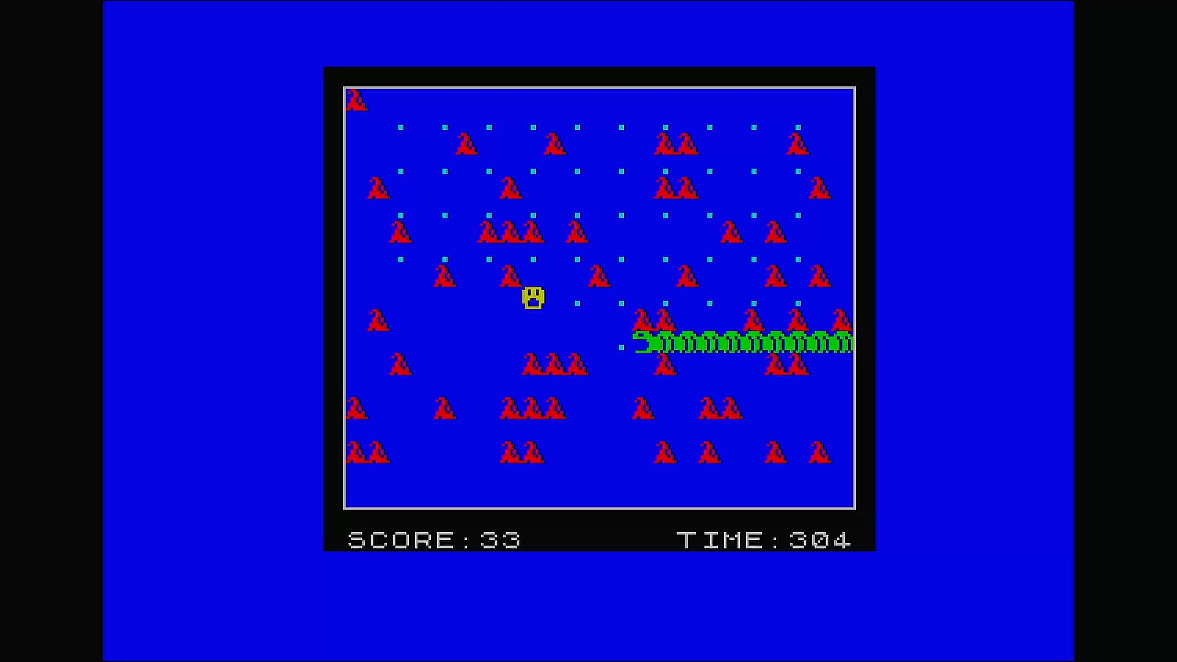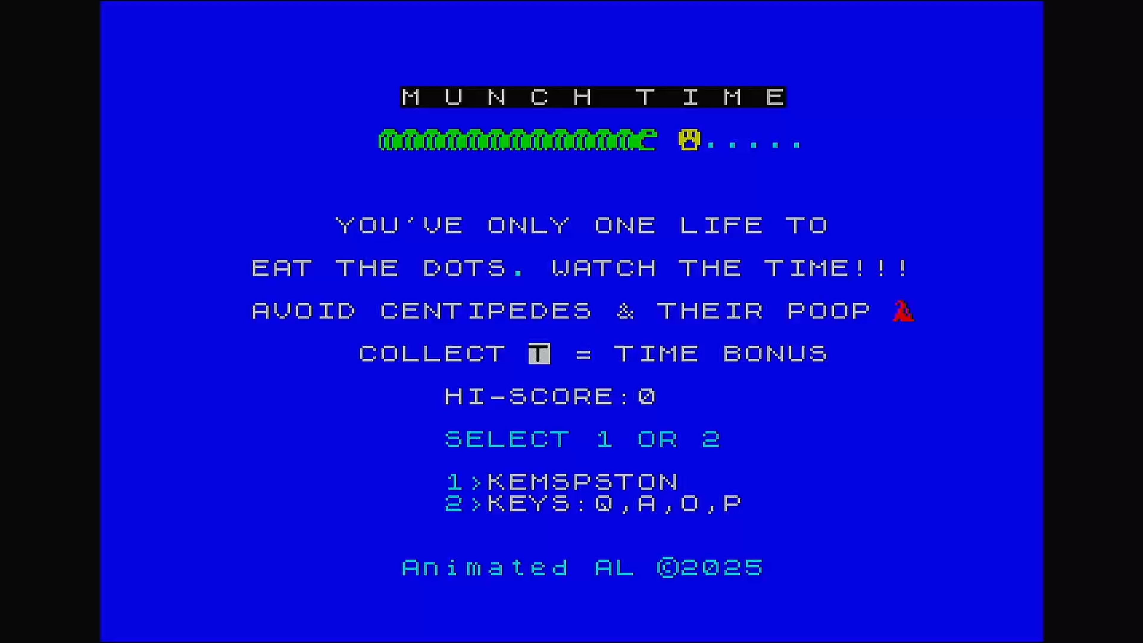 You've only one life to eat the dots . Watch the time!!! Avoid centipedes and their poop. If a centipede eats the poop or a dot more poop will appear, also as you venture through each screen more poop appears and the time decreases, a flashing T will appear if your time drops below 50, collect it to gain an extra time bonus.